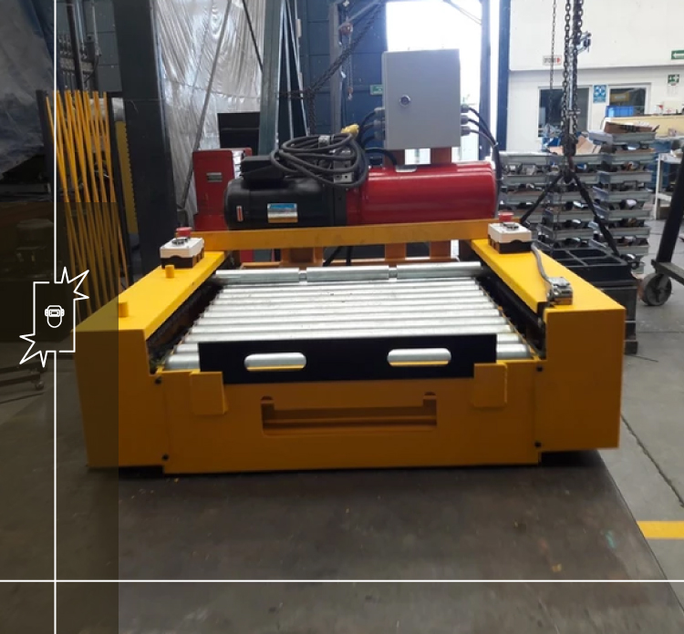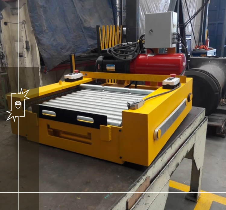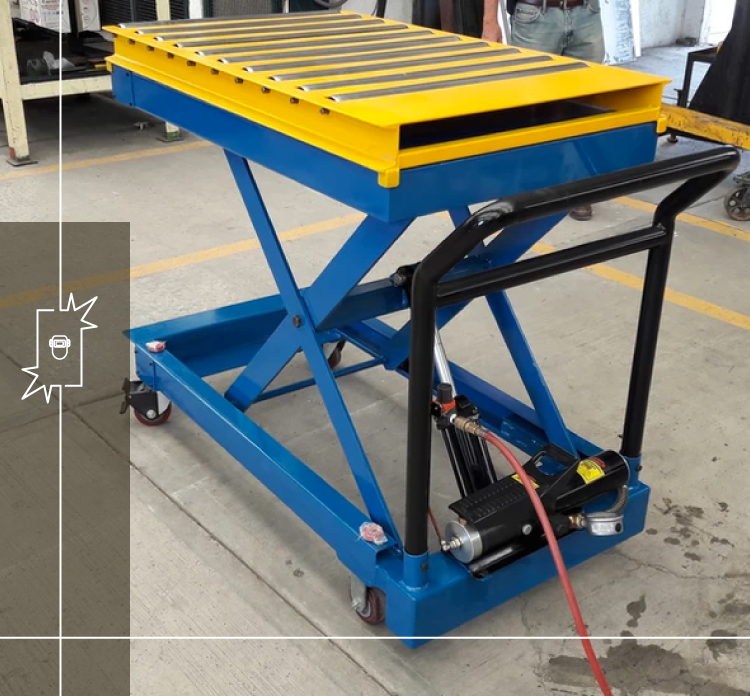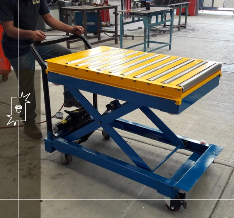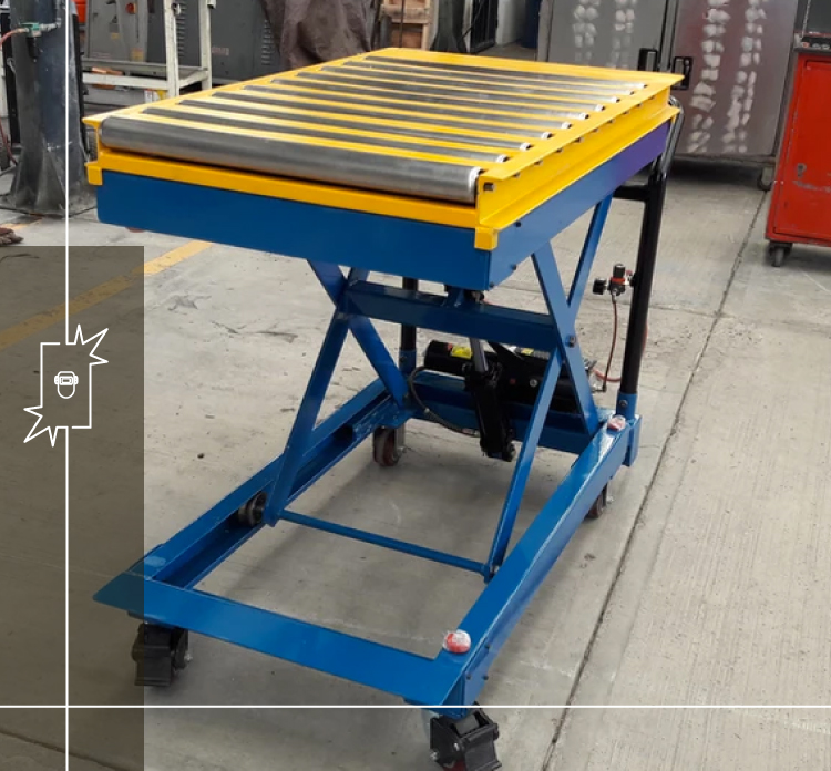 Mesas elevadoras: montadas sobre carro con o sin plataforma de rodillos accionadas neumáticamente con capacidad hasta 500 kg.